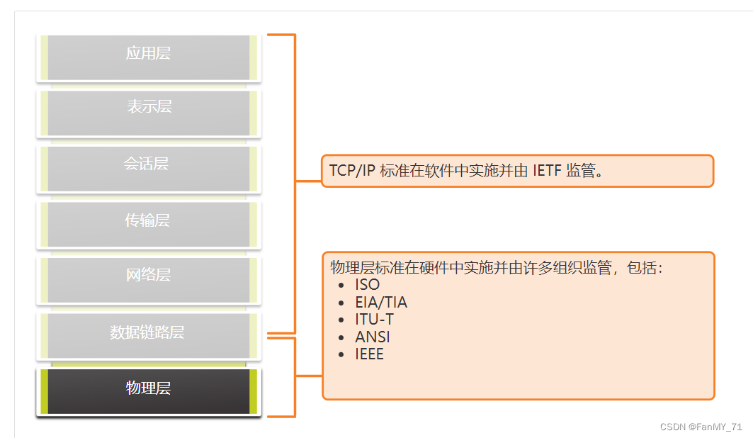 物理层由工程师开发的电子电路、介质和连接器组成。因此,由相关的电气和通信工程组织定义管制该硬件的标准是很合适的。