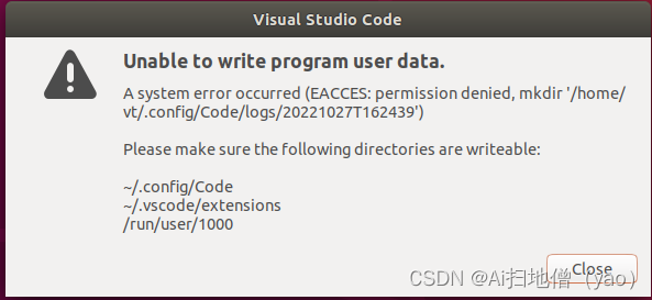 在 Ubuntu 中打开 VScode 出现 error:unable to write program user data_yimaoshu的博客-CSDN博客