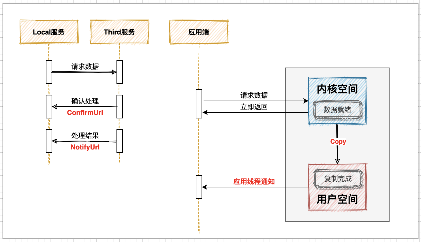 在异步模式下,彻底摒弃阻塞机制,过程分段进行交互,这与常规的第三方对接模式很相似,本地服务在请求第三方服务时,如果请求过程耗时很大,会异步执行,第三方第一次回调,确认请求可以被执行;第二次回调则是推送处理结果,这种思想在处理复杂问题时,可以很大程度的提高性能,节省资源: