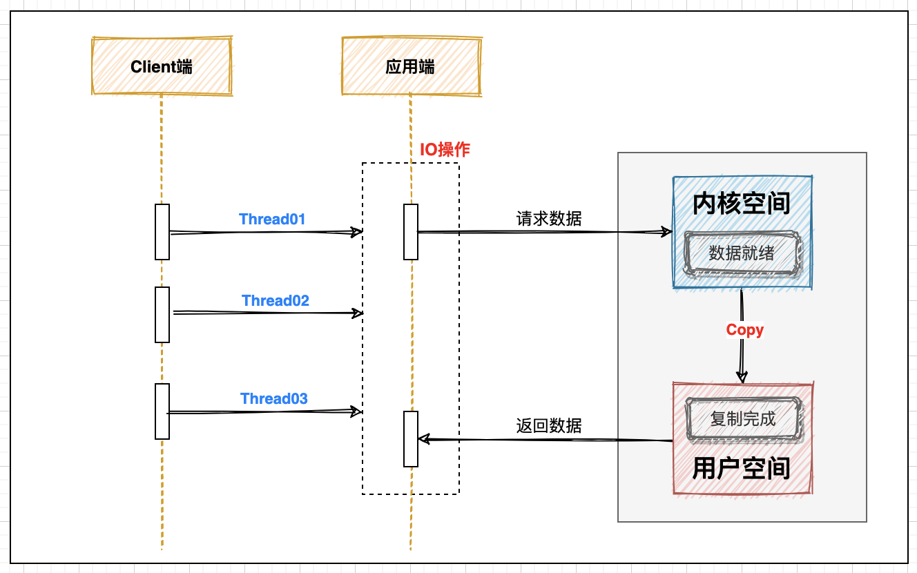 用户线程与内核的交互方式,应用端请求对应一个线程处理,整个过程中accept(接收)和read(读取)方法都会阻塞直至整个动作完成: