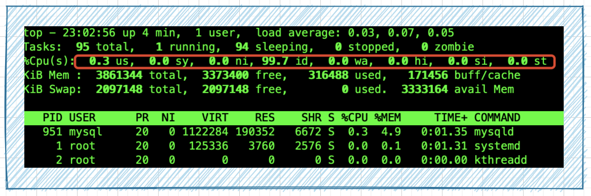 us:用户空间占用CPU的百分比;sy:内核空间占用CPU的百分比;id:空闲进程占用CPU的百分比;wa:IO等待占用CPU的百分比;