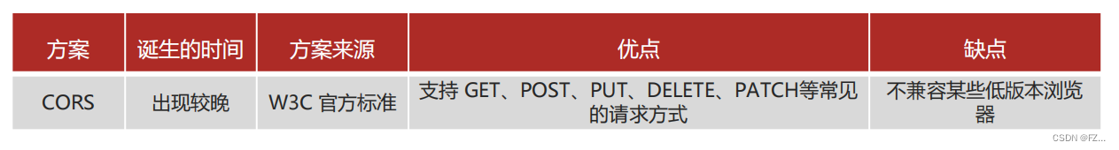 - CORS 在浏览器中有兼容性。只有支持 XMLHttpRequest Level2 的浏览器,才能正常访问开启了 CORS 的服务端接口(例如:IE10+、Chrome4+、FireFox3.5+)