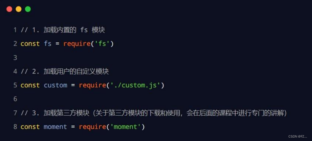 - 第三方模块(由第三方开发出来的模块,并非官方提供的内置模块,也不是用户创建的自定义模块,使用前需要先下载)