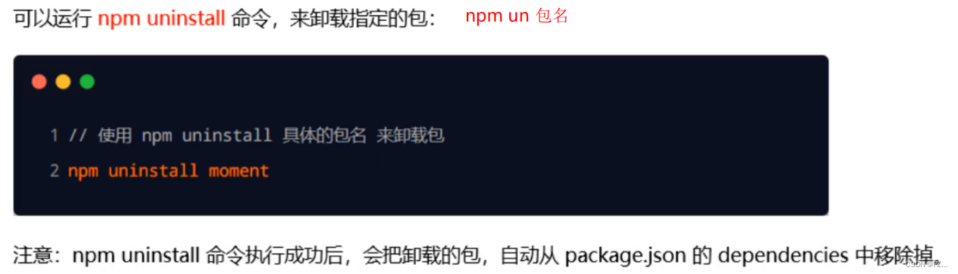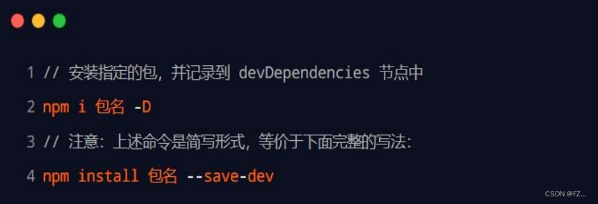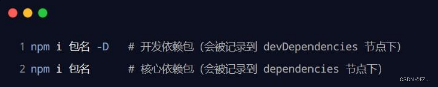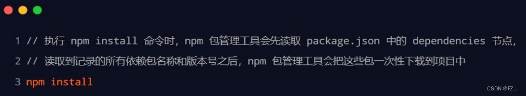 - 运行 npm install 命令安装包的时候,npm 包管理工具会自动把包的名称和版本号,记录到 package.json 中。