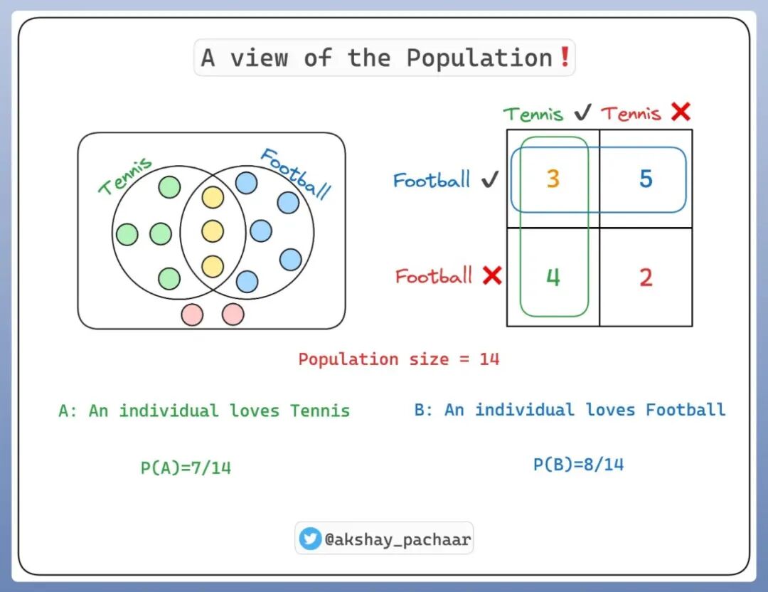 所以,如果要计算一个人在喜欢足球的情况下,还喜欢网球的概率,计算方法为 P(A|B)=P(A∩B)/P(B)=(3/14)/(8/14)=3/8。