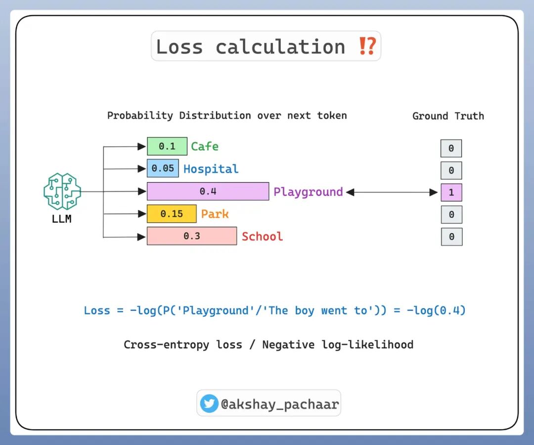 而 LLM 学习的是一个高维度的单词序列概率分布。这个分布的参数就是经过训练的权重。但是这种概率毕竟是一种预测,并不是实际的结果,所以这个过程中就有一个 损失计算(Loss calculation) 的概念。