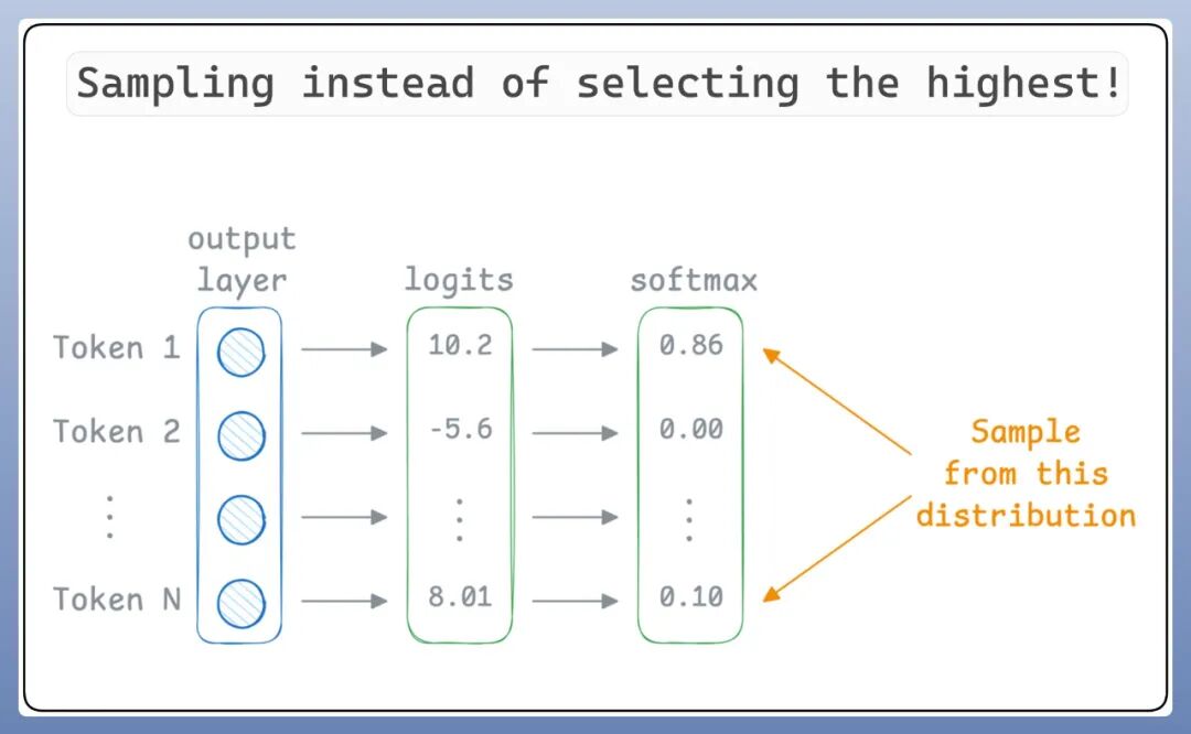 所以 LLM 并不是选择最佳(概率最大)的 token,而是对预测进行采样。所以,概率最高的 token 也有可能不会被选中。