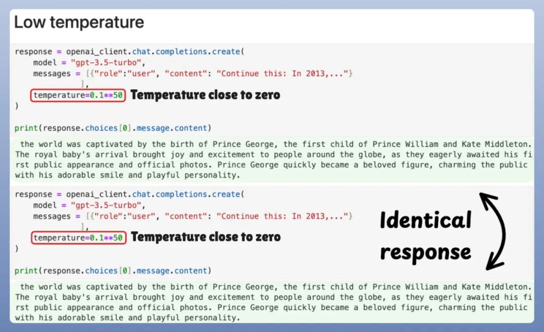 - • Low temperature(低温度,比如 0.1 ~ 0.5):模型的输出会更加具有确定性,也就是更倾向于选择概率较高的单词,此时生成的文本更连贯、理性,内容更“保守”,但是也可能缺乏多样性和创意。