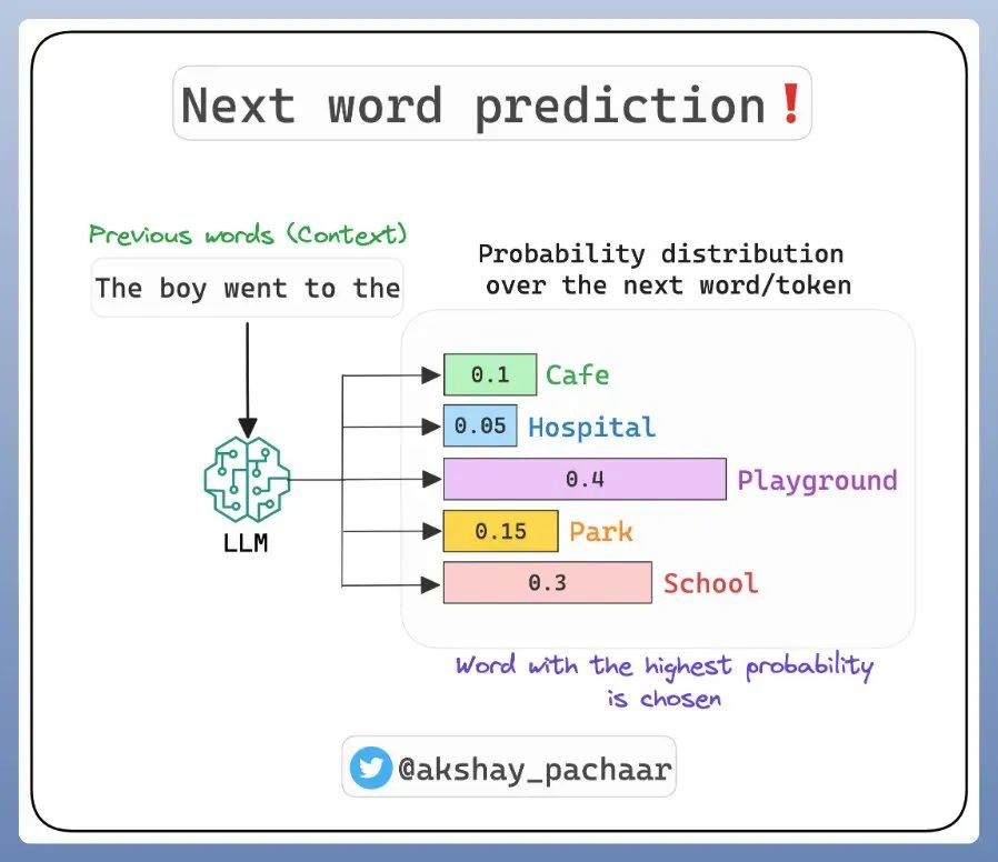 回到 LLM 上来说,这些模式的任务就是预测下一个出现的单词。这就和前面讲的条件概率类似:如果给定已经出现过的单词,那下一个最可能出现的单词是哪一个?