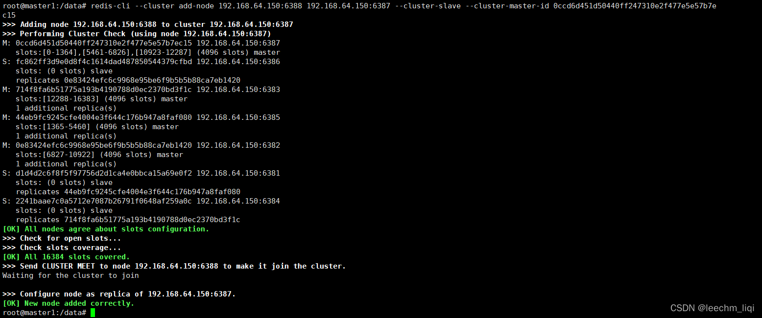 root@master1:/data# redis-cli --cluster add-node 192.168.64.150:6387 192.168.64.150:6381