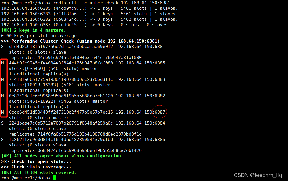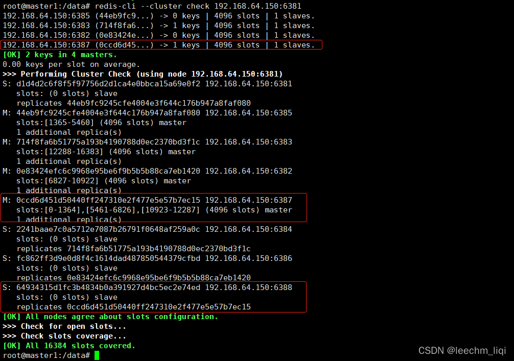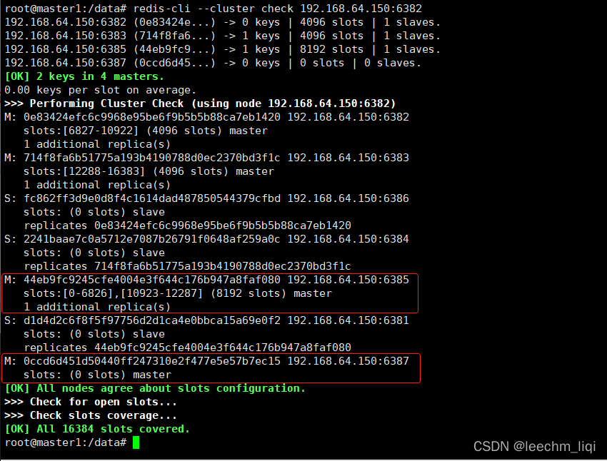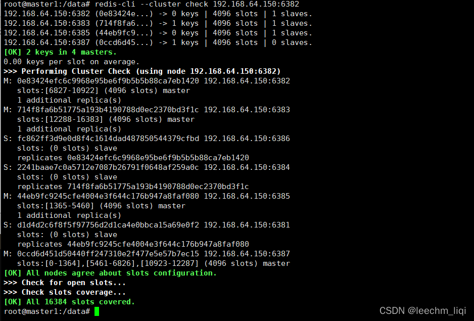 root@master1:/data# redis-cli --cluster check 192.168.64.150:6381