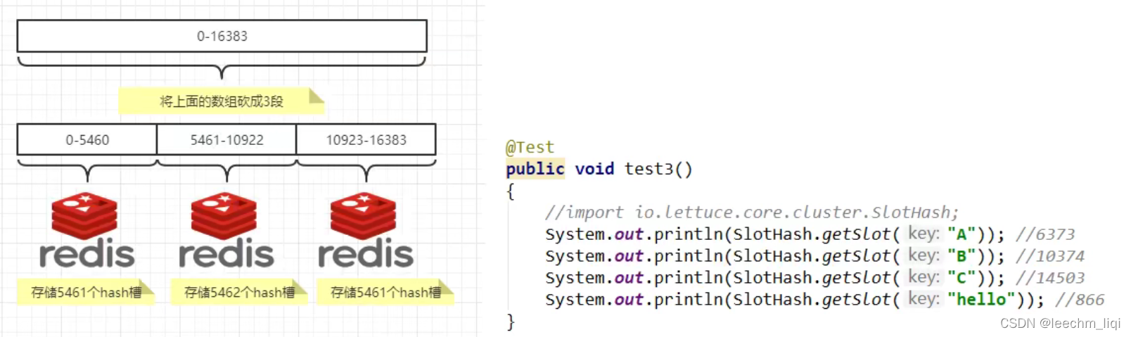 Redis集群中内置了16384个哈希槽,Redis会根据节点数量大致均等的将哈希槽映射到不同的节点。当需要在Redis集群中放置一个key-value时,Redis先对key使用crc16算法算出一个结果,然后把结果对16384求余数,这样每个key都会对应一个编号在0-16383之间的哈希槽,也就是映射到某个节点上。如下代码,key之A,B,在node2上,key之C在node3上