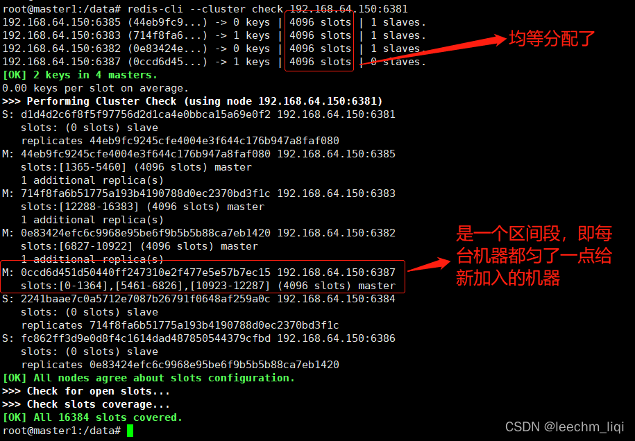 我们刚开始的三主三从的集群对于槽位的分配几乎是均等分配到三台master机器中,那么此时加入进来一台机器,这个槽位的分配又变成什么样的呢?是重新分配,还是集群中各自匀一点出来给新的机器呢?答案是后者,各自匀一点slot。