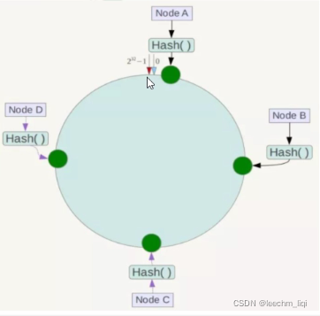 它也是按照取模的方式,前面笔记介绍节点取模法是对节点(服务器)的数量进行取模。而一致性hash算法是对2^32取模,简单来说,一致性hash算法将整个hash值空间组织成一个虚拟的圆环,如假设某hash函数H的值空间为0-2^32-1(即hash值是一个32位无符号整形),整个hash环如下,整个空间按照顺时针方向组织,圆环的正上方的点代表0,0点右侧的第一个点代表1,以此类推,2,3,4......直到2^32-1,也就是说0点左侧的第一个点代表2^32-1,0和2^32-1在零点中方向重合,我们把整个由2^32个点组成的圆环称为hash环。