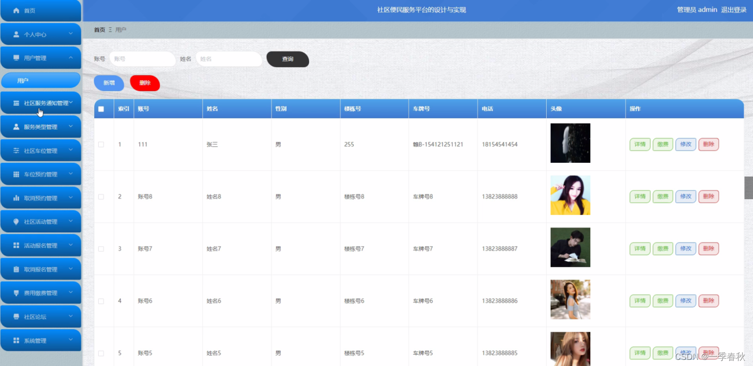 管理员点击用户管理,在用户管理页面对账号、姓名、性别、楼栋号、车牌号、电话、头像等信息,可以查询、新增、修改或删除用户信息等操作。如图5-8所示: