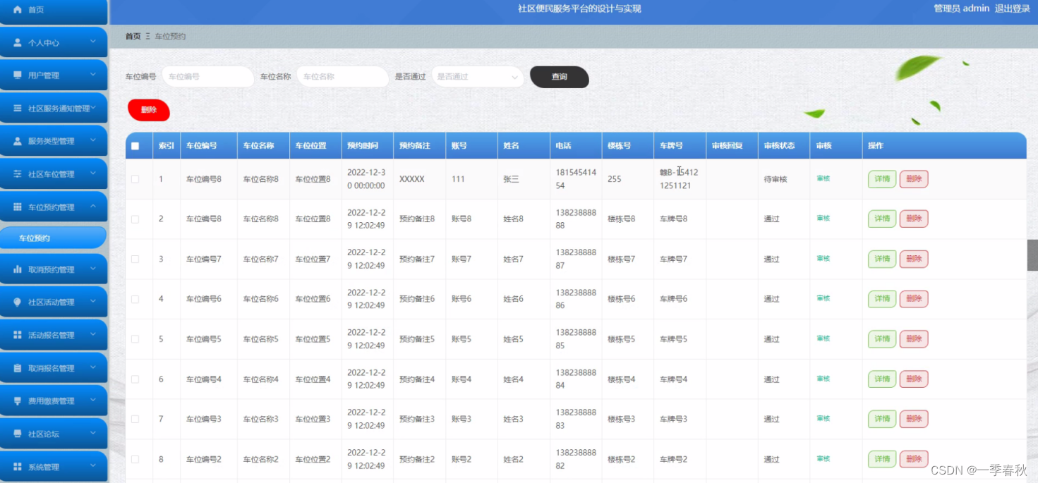 管理员点击车位预约管理,在车位预约管理页面对车位编号、车位名称、车位位置、预约时间、预约备注、账号、姓名、电话、楼栋号、车牌号、审核回复、审核状态、审核等信息,可以查询或删除车位预约等操作。如图5-10所示: