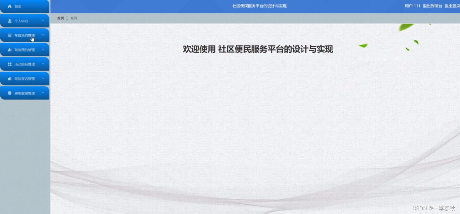 管理员进入主页面,主要功能包括对首页、个人中心、用户管理、社区服务通知管理、服务类型管理、社区车位管理、车位预约管理、取消预约管理、社区活动管理、活动报名管理、取消报名管理、费用缴费管理、社区论坛、系统管理等进行操作。管理员主页面如图5-7所示: