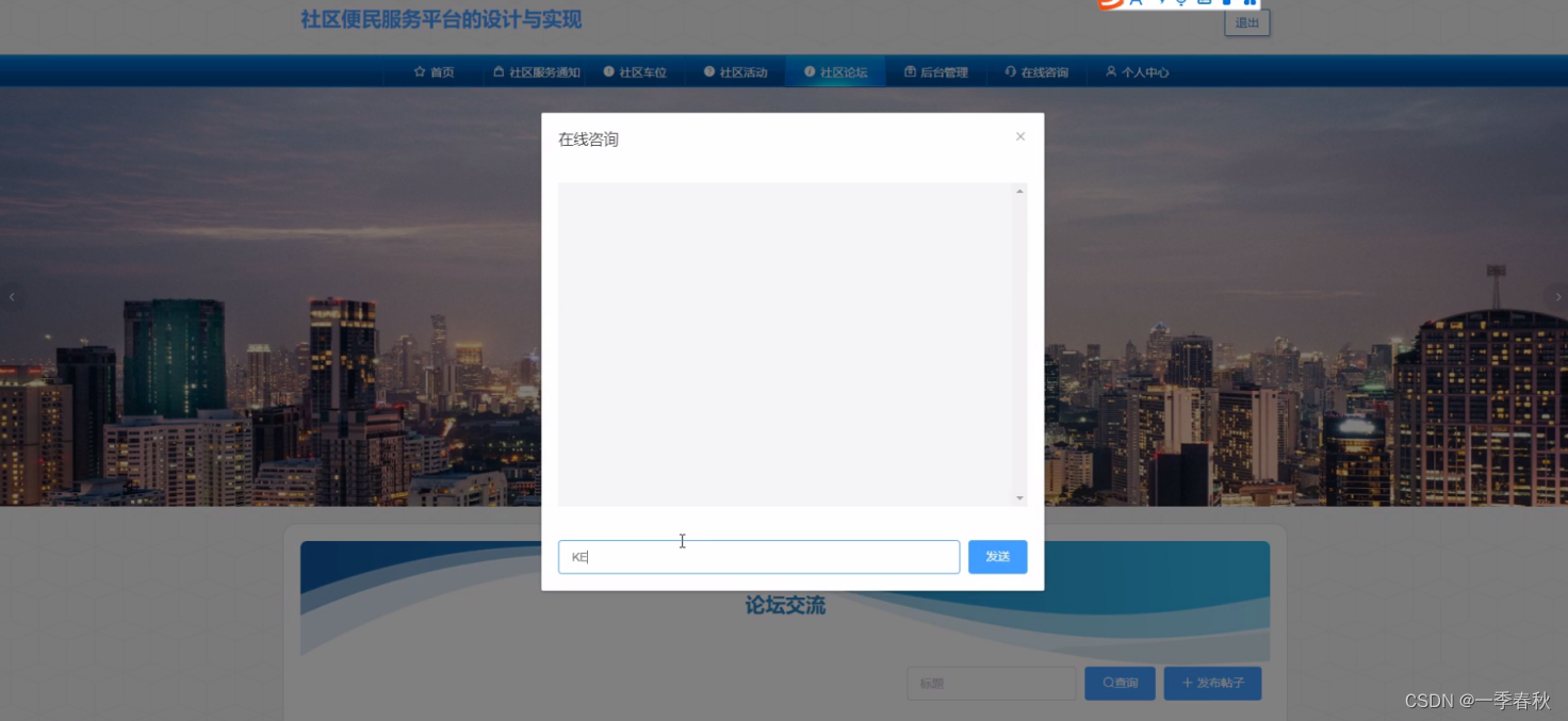 点击在线咨询,用户可以输入内容进行咨询,管理员可以在后台进行查看并回复,达到用户和管理员交流的效果,如图5-5所示: