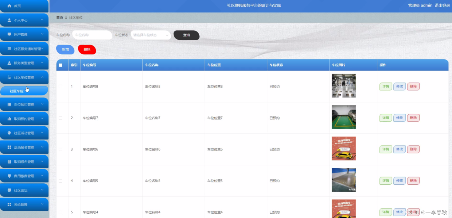 管理员点击社区车位管理,在社区车位管理页面对车位编号、车位名称、车位位置、车位状态、车位图片等信息,可以查询、新增、修改或删除社区车位等操作。如图5-9所示: