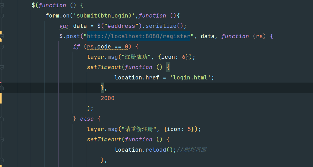 layui form.on(),使用Ajax请求时回调不执行的解决办法 <script> layui.use(['layer', 'form'], function () { var form = layui.form; form.on('submit(btnLogin)', function () { var data = $("#address").serialize(); $.ajax({ type: "POST",