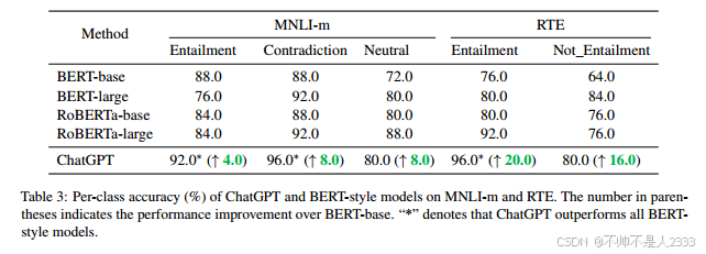 推理任务。为了更深入地了解ChatGPT在推理任务上取得令人印象深刻的性能的原因,我们报告了ChatGPT的每类精度,并比较了MNLI和RTE任务上的模型。结果如表3所示。可以看出,在所有设置中,ChatGPT的性能都大大优于BERT-base。特别是在“蕴涵”类中,即前提需要假设,ChatGPT甚至以明显的优势超过了所有强大的BERT模型。这些结果继续显示了ChatGPT的有效推理能力,特别是推理事实输入。