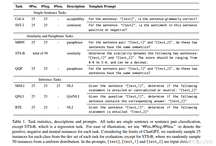 任务和数据集。遵循许多先前的工作(Zhong等,2022a,2023),我们使用广泛使用的GLUE基准(Wang等,2019)进行模型评估。作为最受欢迎的NLU基准之一,GLUE包含几个具有挑战性的NLU任务,包括语言可接受性(CoLA, Warstadt等(2019)),情感分析(SST-2, Socher等(2013)),释义(MRPC, Dolan和Brockett(2005)),文本相似性(STS-B, Cer等(2017)),问题释义(QQP),文本蕴含(MNLI, Williams等(2018),RTE, Giampiccolo等(2007))和问答蕴含(QNLI, Rajpurkar等(2016))。考虑到测试ChatGPT的限制,我们遵循Jiao等(2023)的方法,从开发集随机抽取一个子集作为每个任务的评估数据。具体来说,由于大多数GLUE任务都是分类任务(除了STS-B是回归任务),我们从开发集每个类别中随机抽取25个实例。对于STS-B,我们从一个均匀分布中随机抽取50个实例。表1显示了任务描述和统计数据。