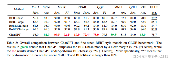 鉴于传统观念认为“GPT风格的模型在生成任务上表现良好,但在理解任务上表现不佳,甚至不如基础大小的BERT(Devlin等,2019)”,我们想知道在ChatGPT场景中是否也存在类似的现象。对于ChatGPT的生成能力,几项先前的研究(Jiao等,2023;Bang等,2023;Wang等,2023)已经显示,ChatGPT在几个生成任务上的性能可以与现有的LLMs相媲美甚至更好。然而,ChatGPT是否在自然语言理解(NLU)任务上也表现良好,这仍然不清楚。