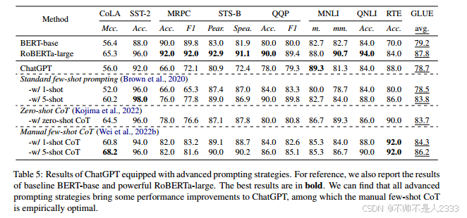 在GLUE基准测试上,配备高级提示策略的ChatGPT的整体结果如表5所示。为了参考,我们还比较了改进后的ChatGPT与基线BERT-base和强大的RoBERTa-large模型。基于这些实证结果,我们可以进一步发现: