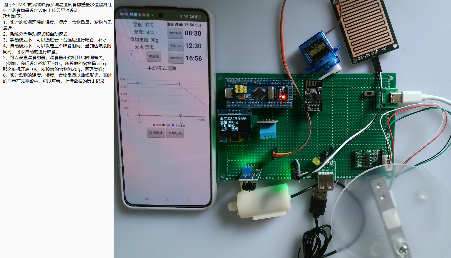 基于STM32的宠物喂养系统温湿度食物重量水位监测红外监测食物量设定WIFI上传云平台设计