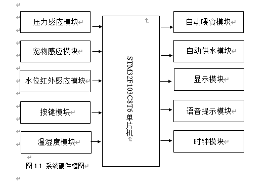 本次系统设计由单片机处理模块、自动喂食模块、自动供水模块、压力感应模块、宠物感应模块、水位红外感应模块、按键模块、时钟模块、显示模块,语音提示模块等组成,系统硬件框图如图1.1所示。