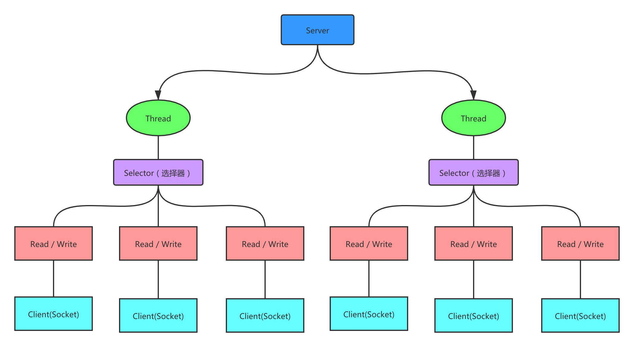 - Java NIO:同步非阻塞,服务器实现模式为一个线程处理多个请求(连接),即客户端发送的连接请求都会注册到多路复用器上,多路复用器轮询到连接有 I/O 请求就进行处理。【简单示意图】