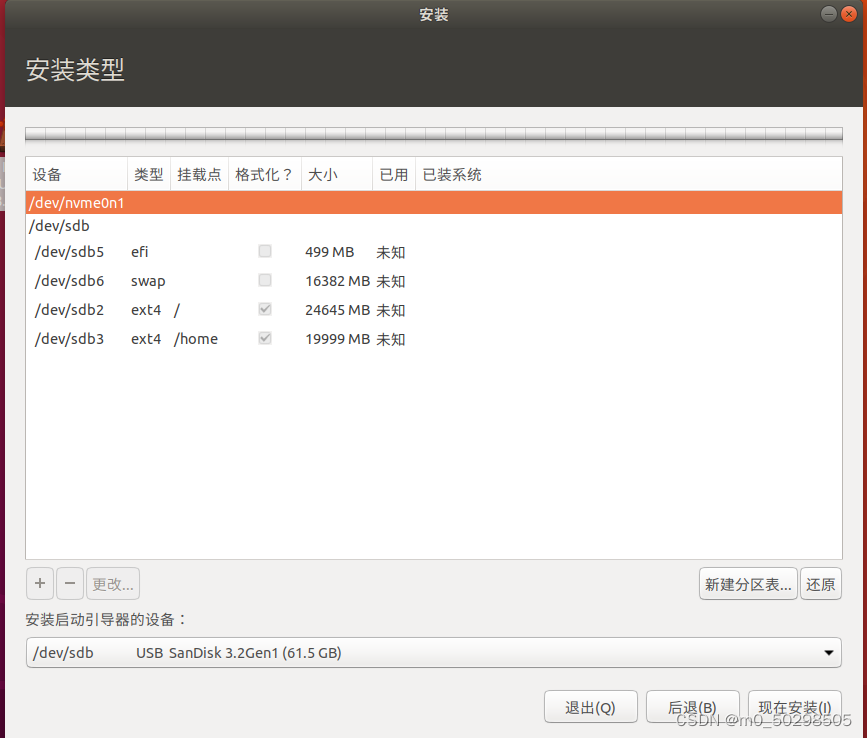 移动硬盘安装ubuntu20.04 准备:virtualbox虚拟机、ubuntu20.04iso 移动硬盘512G usb3.2线(主要是usb2.0太慢了)diskgenius 分区软件。一路点击继续直到,同时关闭安装ubuntu时下载更新(我的散热撑不住,过热容易掉盘)8.按之前分区的方案进行分区,同时安装启动引导器设备选择之前的efi分区。3.启动virtualbox 选择试用ubuntu。10.安装完成,直接关闭虚拟机就行。4.把要安装的移动硬盘接入虚拟机。5.安装ubuntu,点击继续。9.后续就等待安装完成咯。