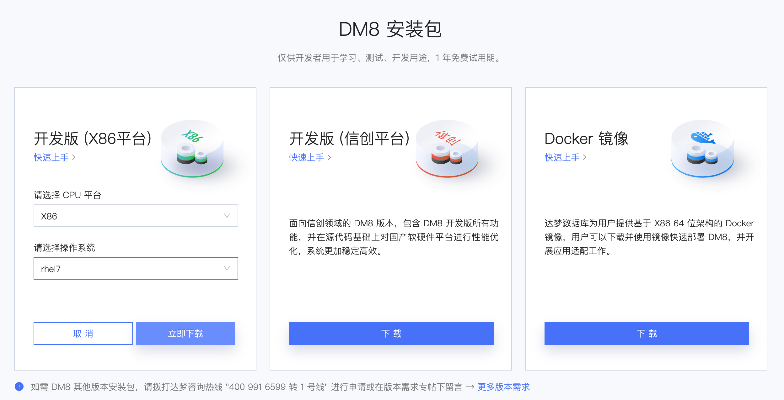 当前达梦官方提供的最新版本为 DM8_20240712,可以在 达梦官网 直接下载: