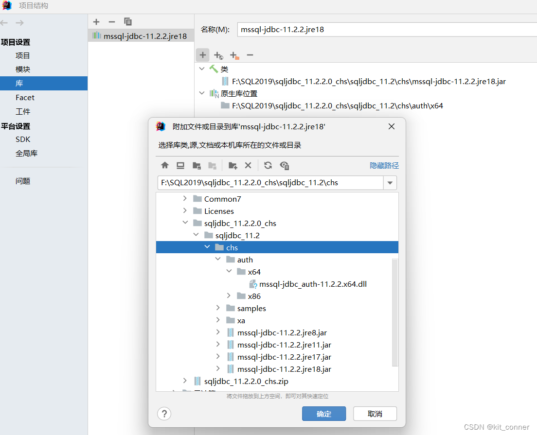 选择jdbc-11.2.2.jre18.jar以及本文件夹下auth-x64(我是x64windows)-jdbc-auth-11.2.2.x64.dll文件加入IDEA的配置中