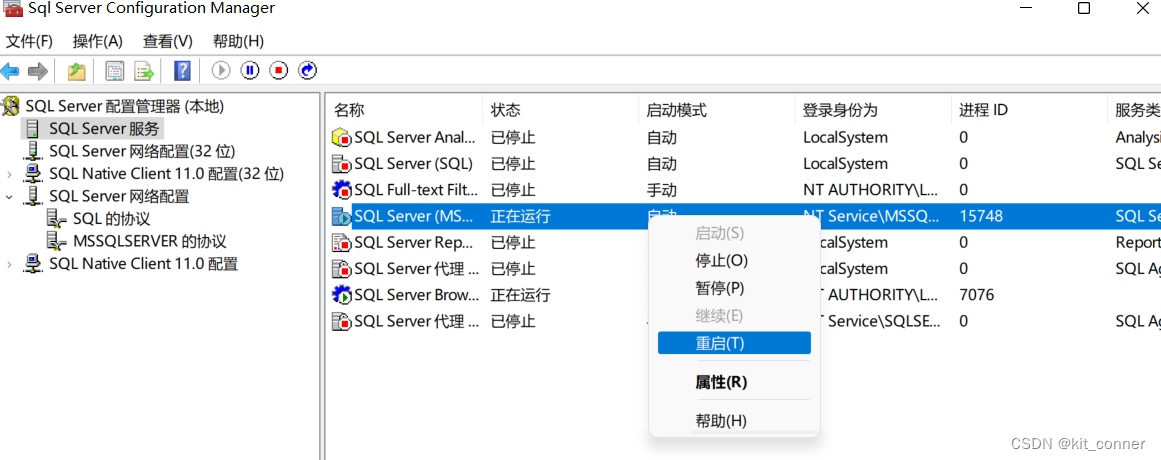重启MSSERVER服务(在sql server的配置管理器中设置)