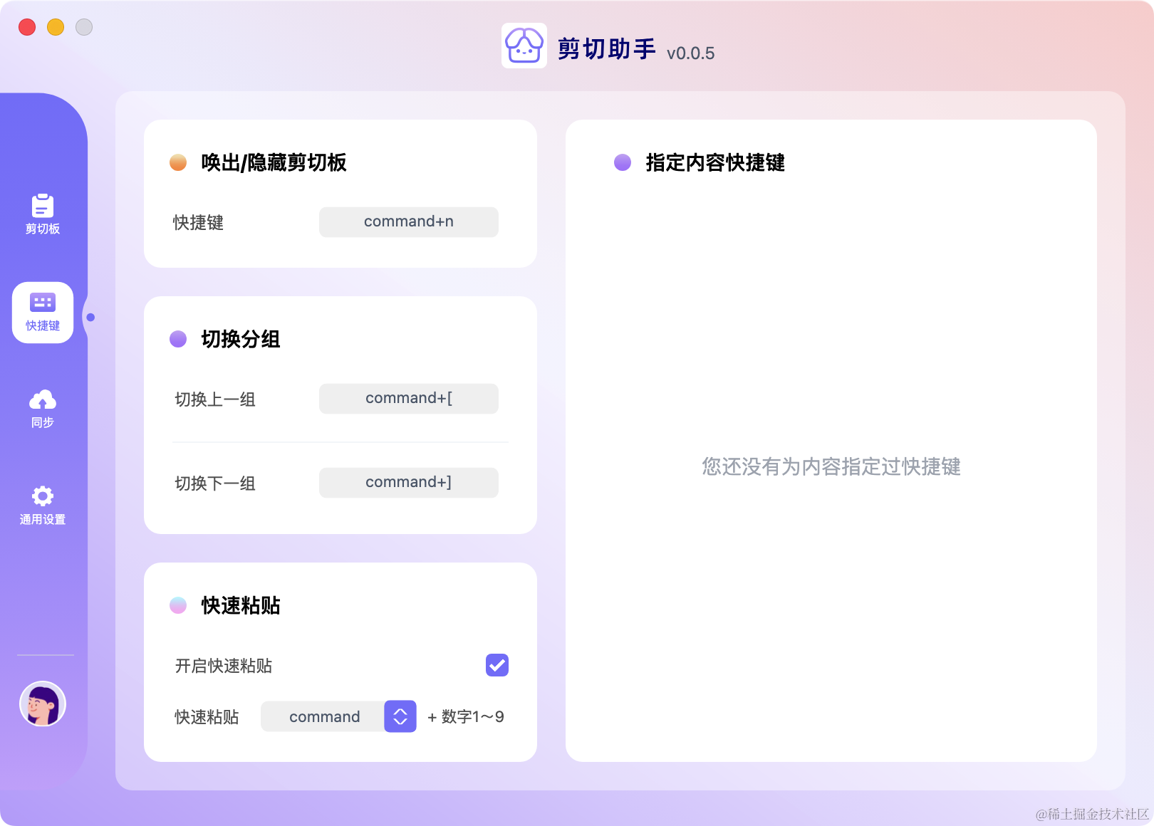 高颜值的跨平台剪切板工具来了!! 做这个软件真的不容易,在开发过程中遇到了很多的问题,为此我也写了一篇保姆级的文档来介绍从开发、打包、签名过程中遇到的一些天坑(踩坑踩麻了,感兴趣的可参考《超完整的Electron打包签名更新指南,这真是太酷啦!这篇文章!如果有人对实现细节感兴趣的话我后续可以写几篇文章来介绍!剪切板的功能还是有很多的,比如复制的内容可以一键分享,这里全部展开讲的话篇幅会很大,欢迎大家自己来体验,下载体验地址!有什么改进和优化的地方欢迎在评论区讨论!!