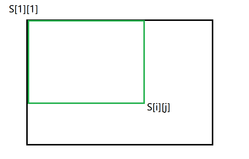 如图所示,让我们求的是绿方块中所有数的和。也就是说对于每一个S[i][j], 表示的是以A[i][j]为右下角的矩阵中所有数的和。