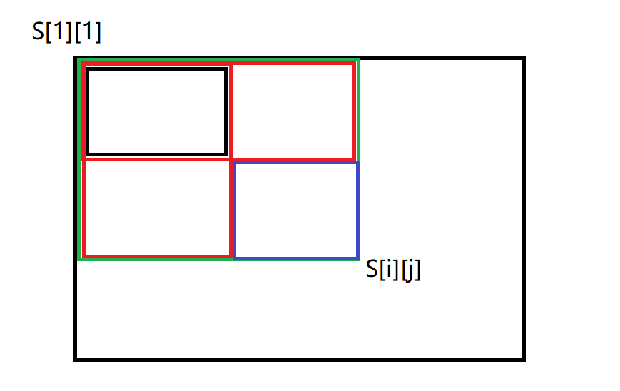 S[ i ][ j ] = S[ i -1][ j ] + S[ i ][ j - 1] - S[ i - 1][ j - 1] + A[ i ] [ j ];