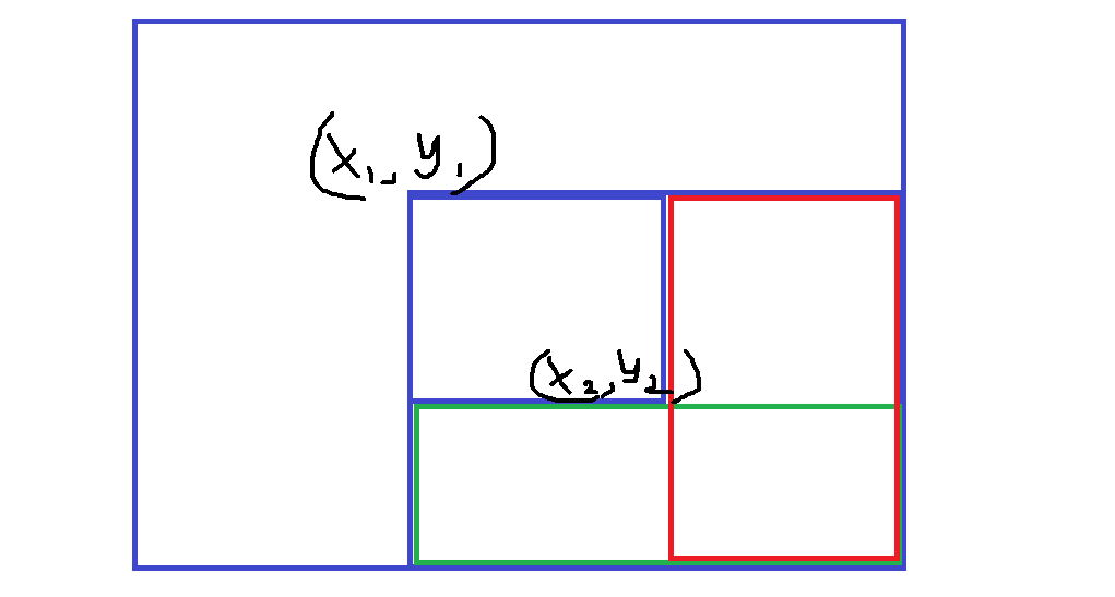 也就是 (x1,y1) ~ (x2, y2)的和 = S[ x2][ y2] - S[x2][ y1 - 1] - S[x1 - 1][y2] + S[ x1 - 1][ y1 -1]