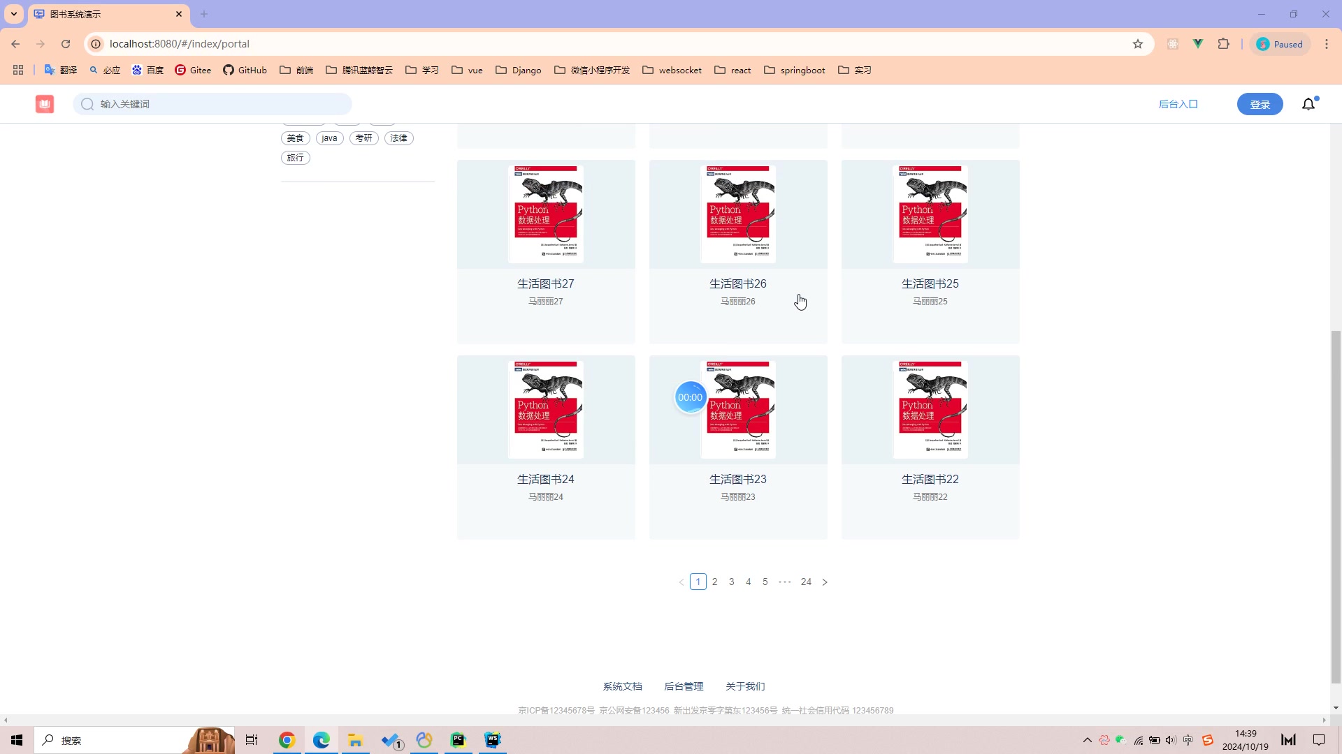 基于Django+Vue的图书借阅管理系统的设计与实现 这是一个基于Django+Vue开发的图书借阅管理系统。采用B/S架构,后端使用Python语言基于开发,前端使用Vue.js框架进行开发,数据库使用MySQL。整个系统包括前台和后台两个部分。