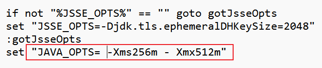 打开后搜索 JAVA_OPTS,将默认位置内容修改为 JAVA_OPTS='-Xms256m - Xmx512m' ,表示初始化内存为 256MB,可用最大内存为 512MB