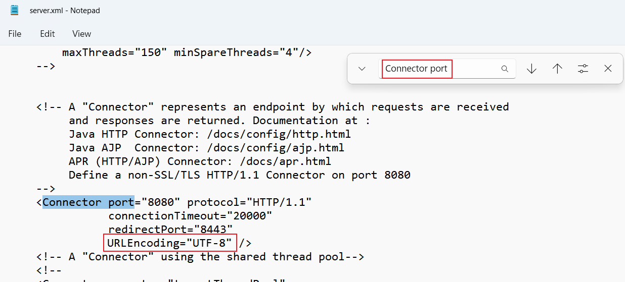 定位到 Connector port ... 位置处添加 URLEncoding="UTF-8" 即可