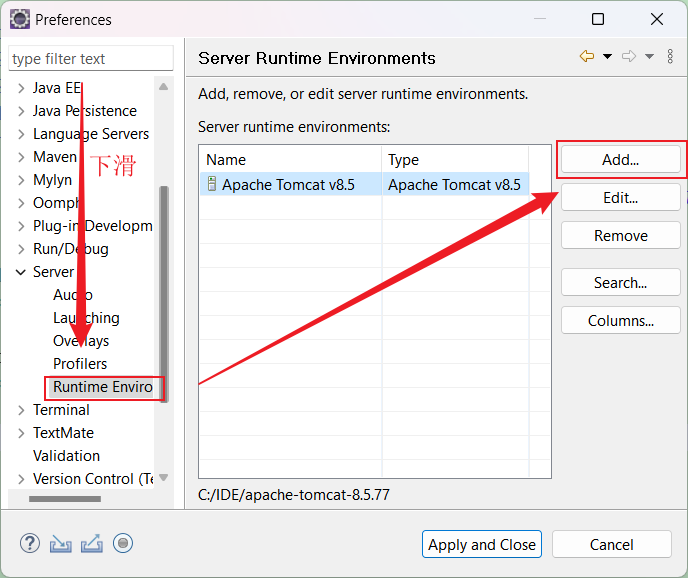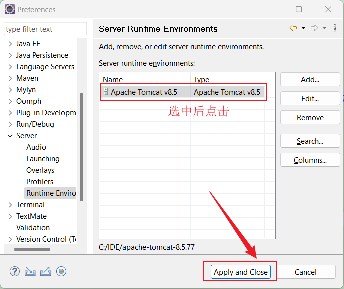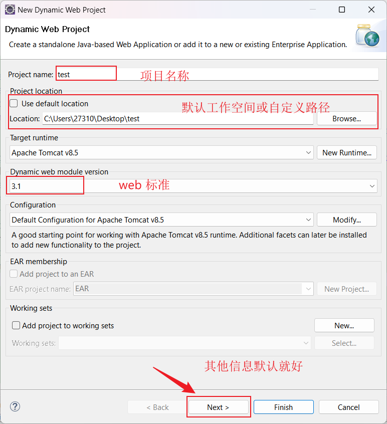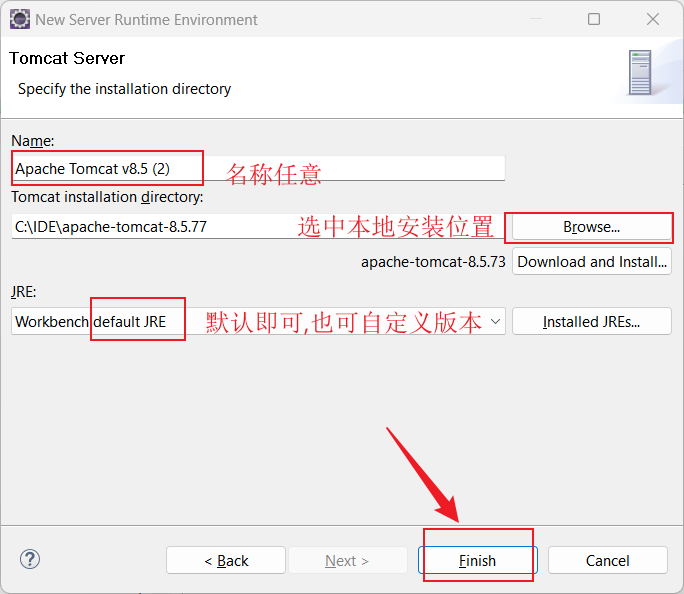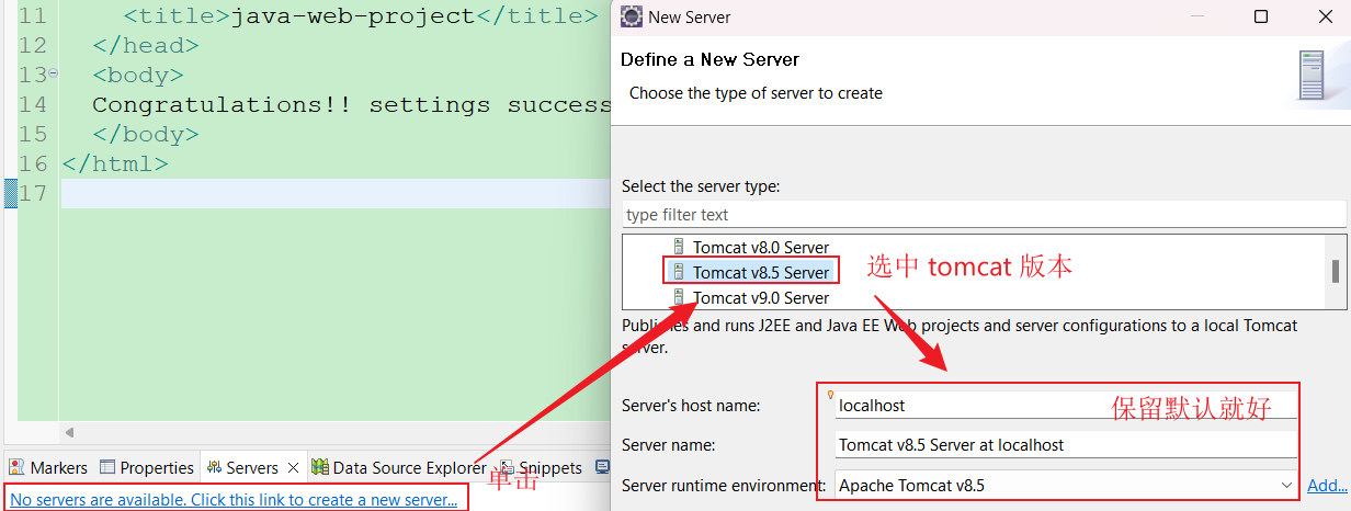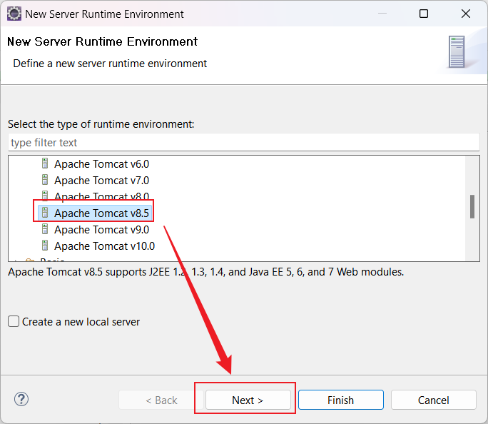 添加 Tomcat Server,选择第一个,注意区分版本,否则会有警告信息