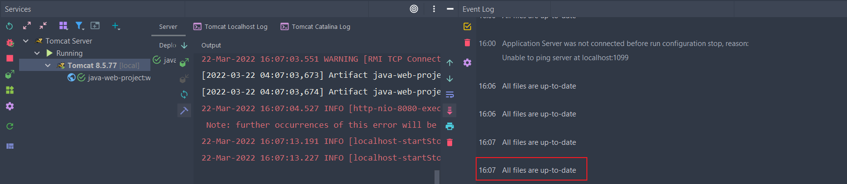 - Intellij IDEA Tomcat Application Server was not connected before run configuration stop, reason: Unable to ping server at localhost:1099