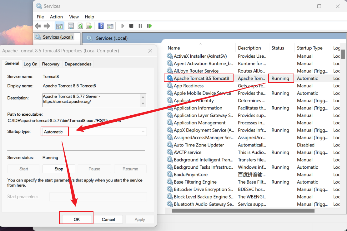 Win+R 执行 services.msc 打开服务窗口,修改 tomcat 启动方式为自动