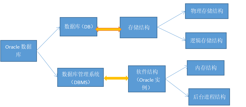 Oracle数据库由存放在磁盘上的数据库(DB)和对磁盘上的数据库进行管理的数据库管理系统(DBMS)两部分构成,分别对应着数据库的存储结构和软件结构。