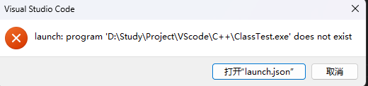 2.问题2:在资源管理器窗口明明已经存在.exe文件,仍然出现弹窗:launch:program 'D:\Study\Project\VScode\C++\ClassTest.exe' does not exist