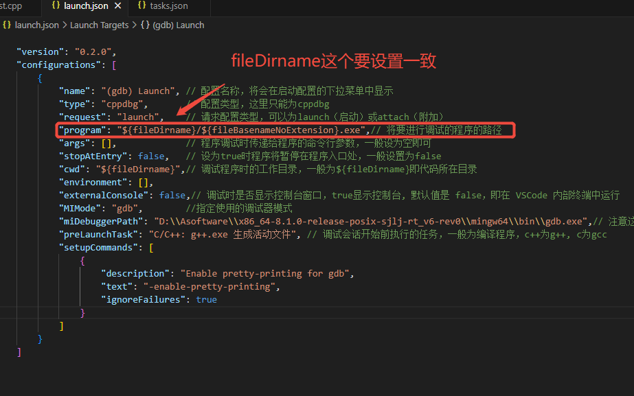 "program": "${workspaceRoot}/${fileBasenameNoExtension}.exe",// 将要进行调试的程序的路径