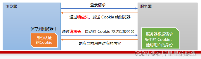 客户端第一次请求服务器的时候,服务器通过响应头的形式,向客户端发送一个身份认证的 Cookie,客户端会自动将 Cookie 保存在浏览器中。