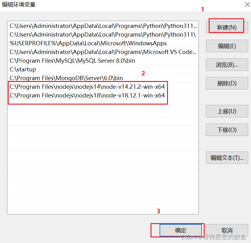 底部任务栏搜索环境变量->选择Path->编辑->新建->填写两个版本的路径->确定
